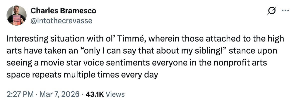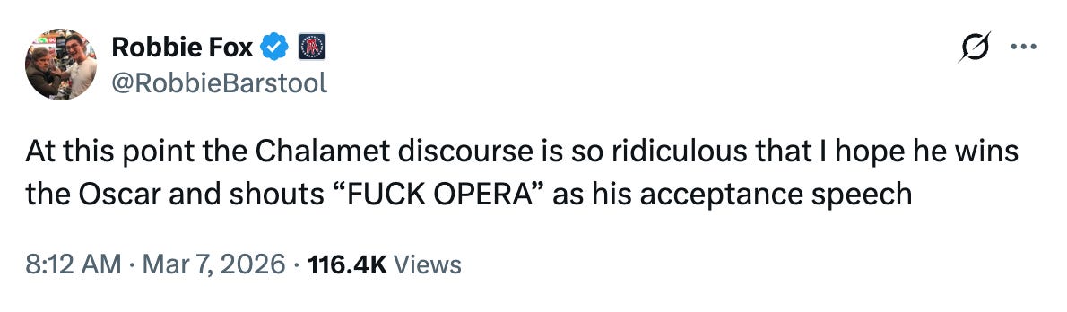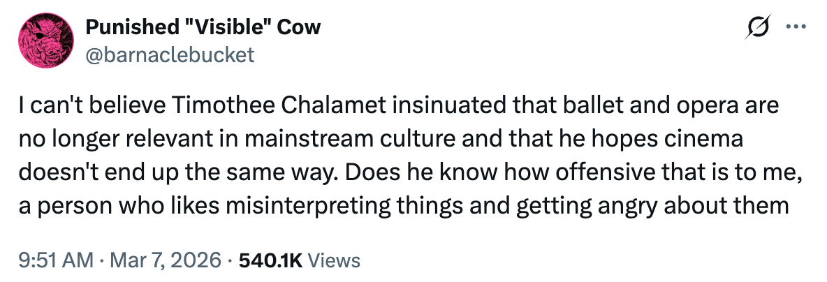 I pray that none of you are so chronically online that you got wrapped up in this week’s internet “drama” about Timothée Chalamet being very mean to opera and ballet people.