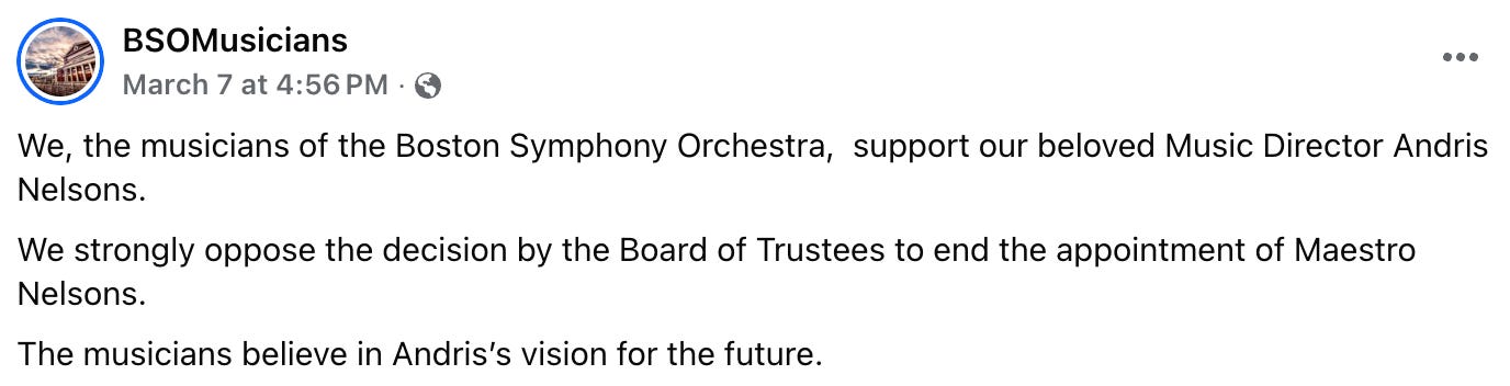 “The decision to not renew his contract was made by the BSO’s Board of Trustees because, beyond our shared desire to ensure our orchestra continues to perform at the highest levels, the BSO and Andris Nelsons were not aligned on future vision.”